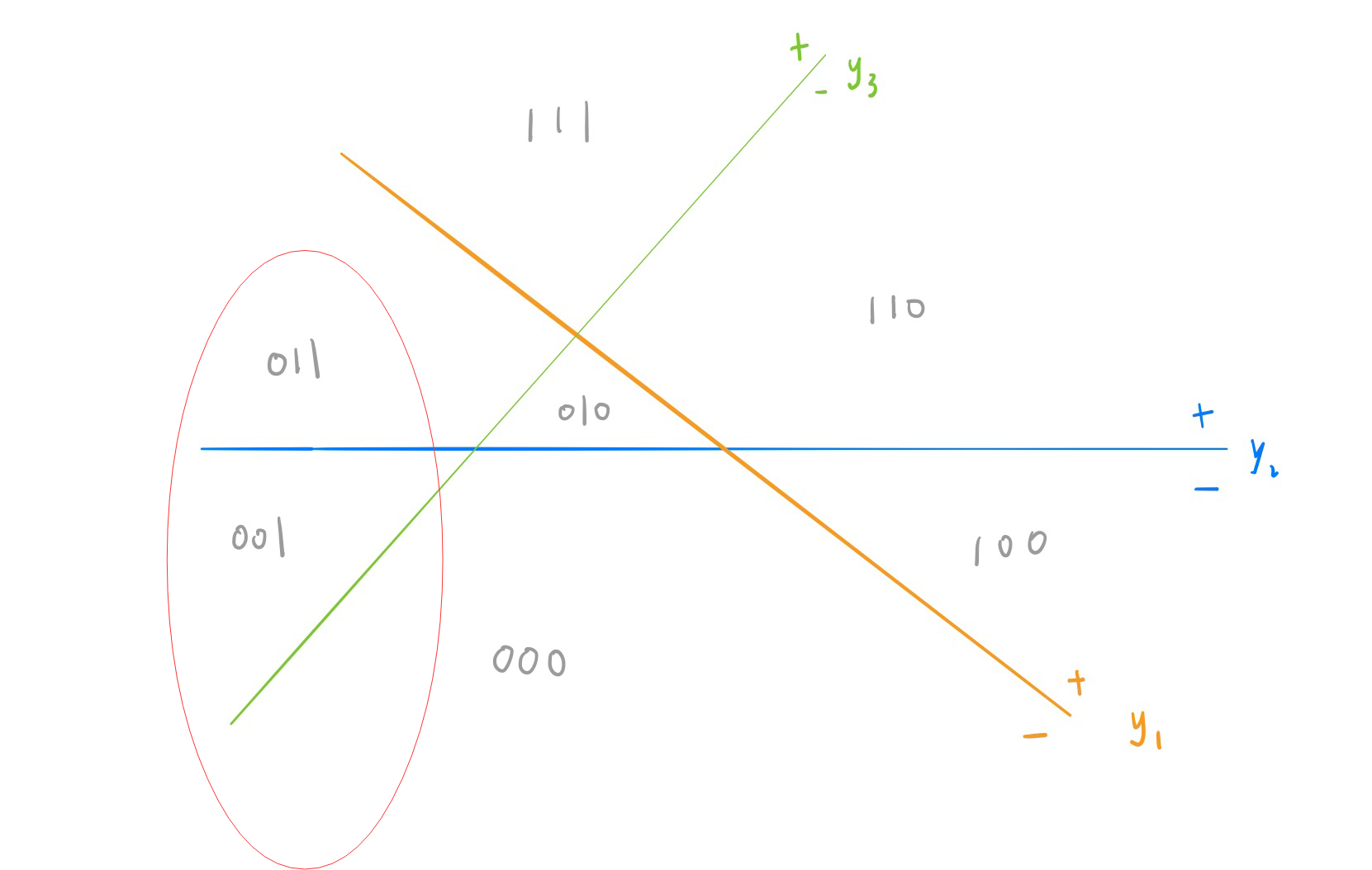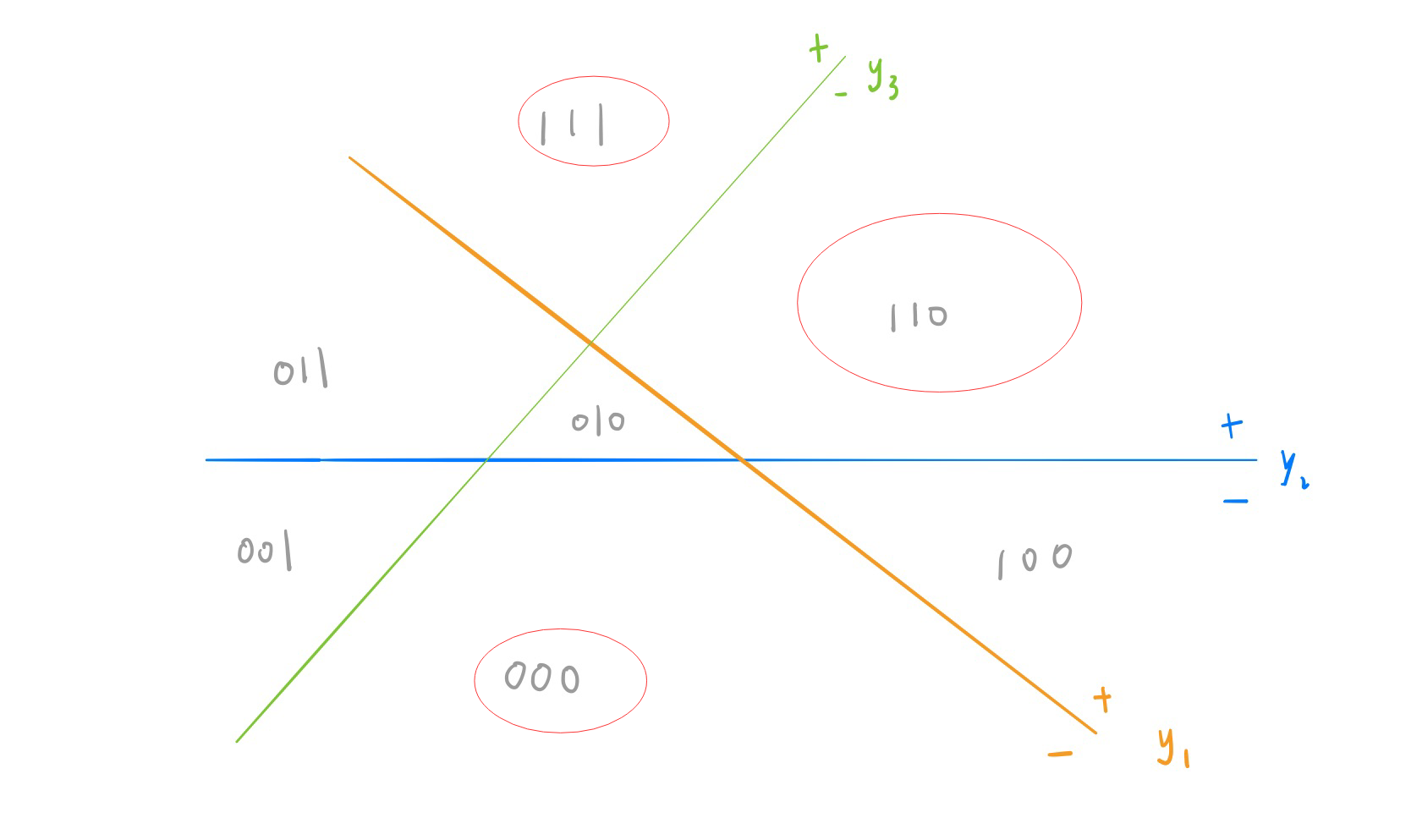 000,001,….111(没有101),总共7个区域,前面我们是通过g1,g2映射到了平面上面的点,现在我们变成了三维,因此映射到了正方体的顶点,如果我们想将(000,001,011)这三个点与其余四个点分开的话,我们可以画出正方体,并且标出点,如下图所示: