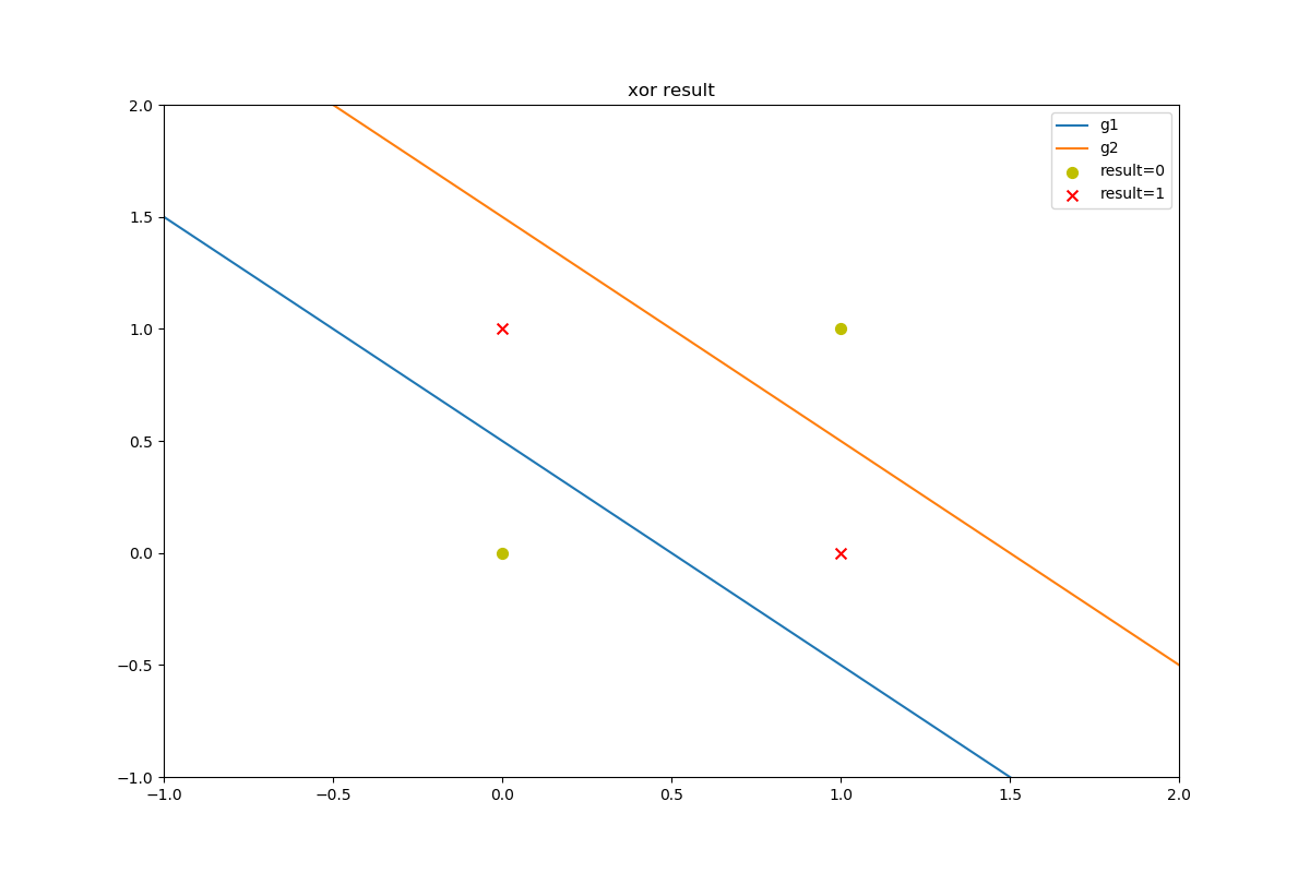 它首先通过两条直线,先用g1直线将(0,0)点与其他三个点(0,1),(1,0),(1,1)分开,再用g2直线将(1,1)与(0,0),(0,1),(1,0)分开