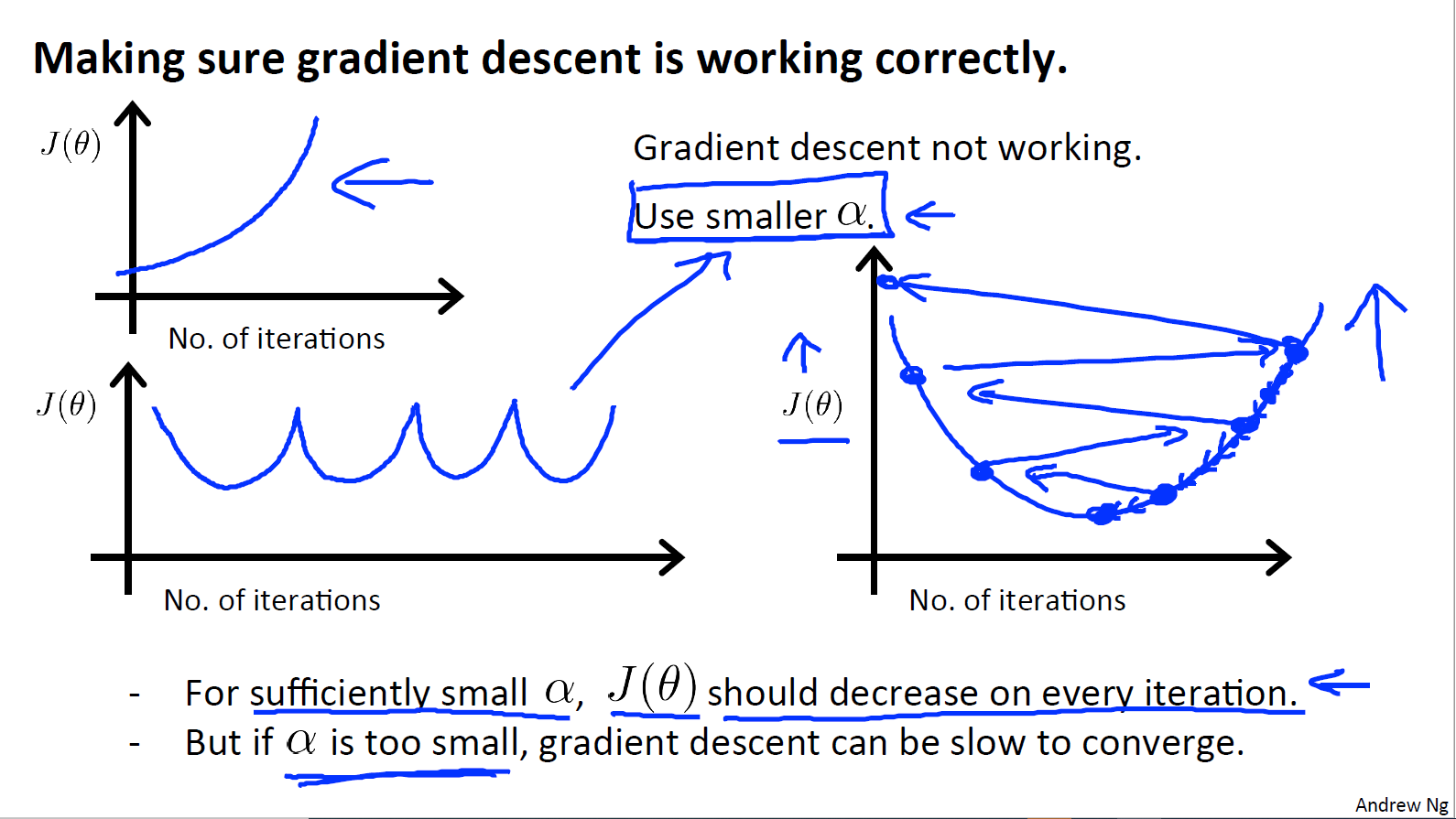 如果我们的$J(\theta)$与iterations的图像是下面这样的,说明梯度下降没有很好的工作,需要使用更小的$\alpha$