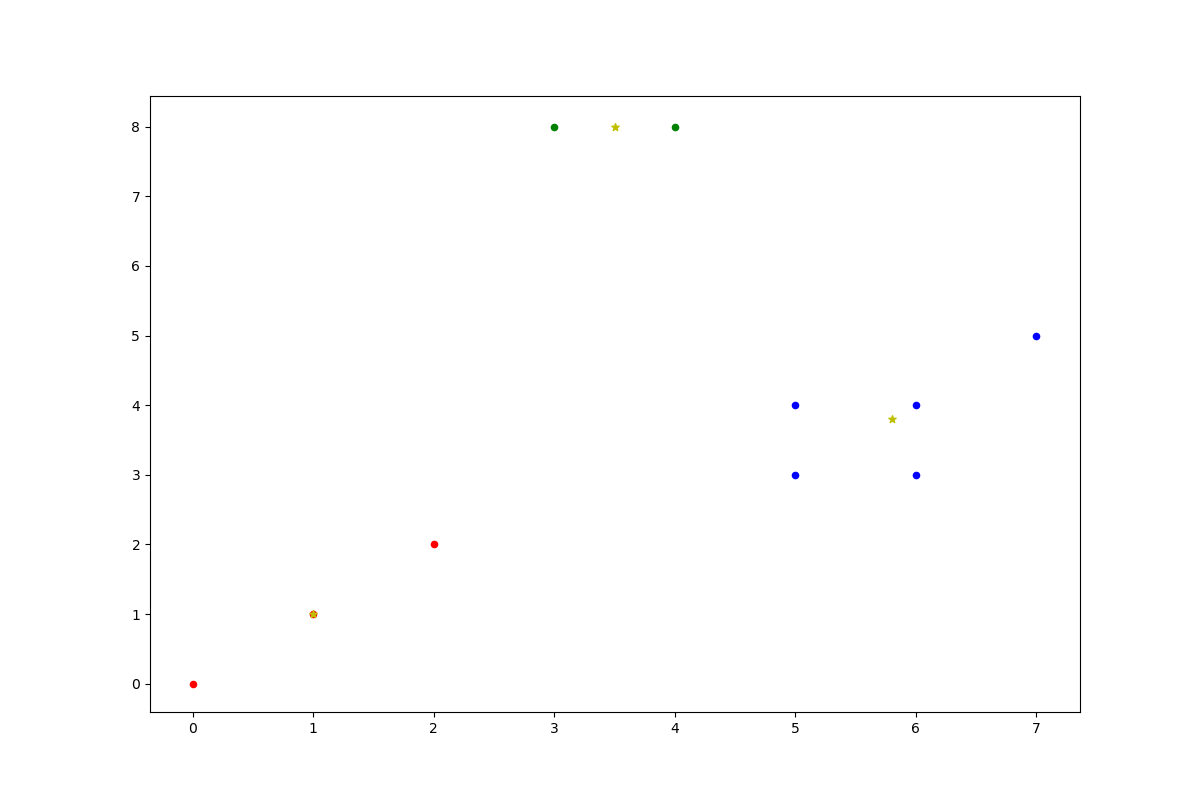 ax.scatter(newCenters[:, 0], newCenters[:, 1], marker='*', s=30, c='y')